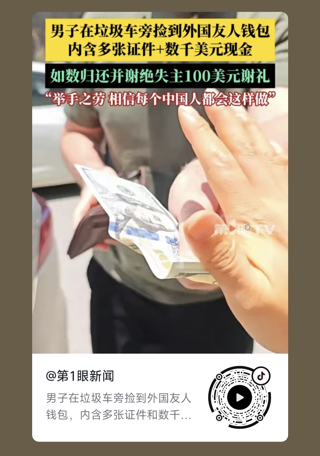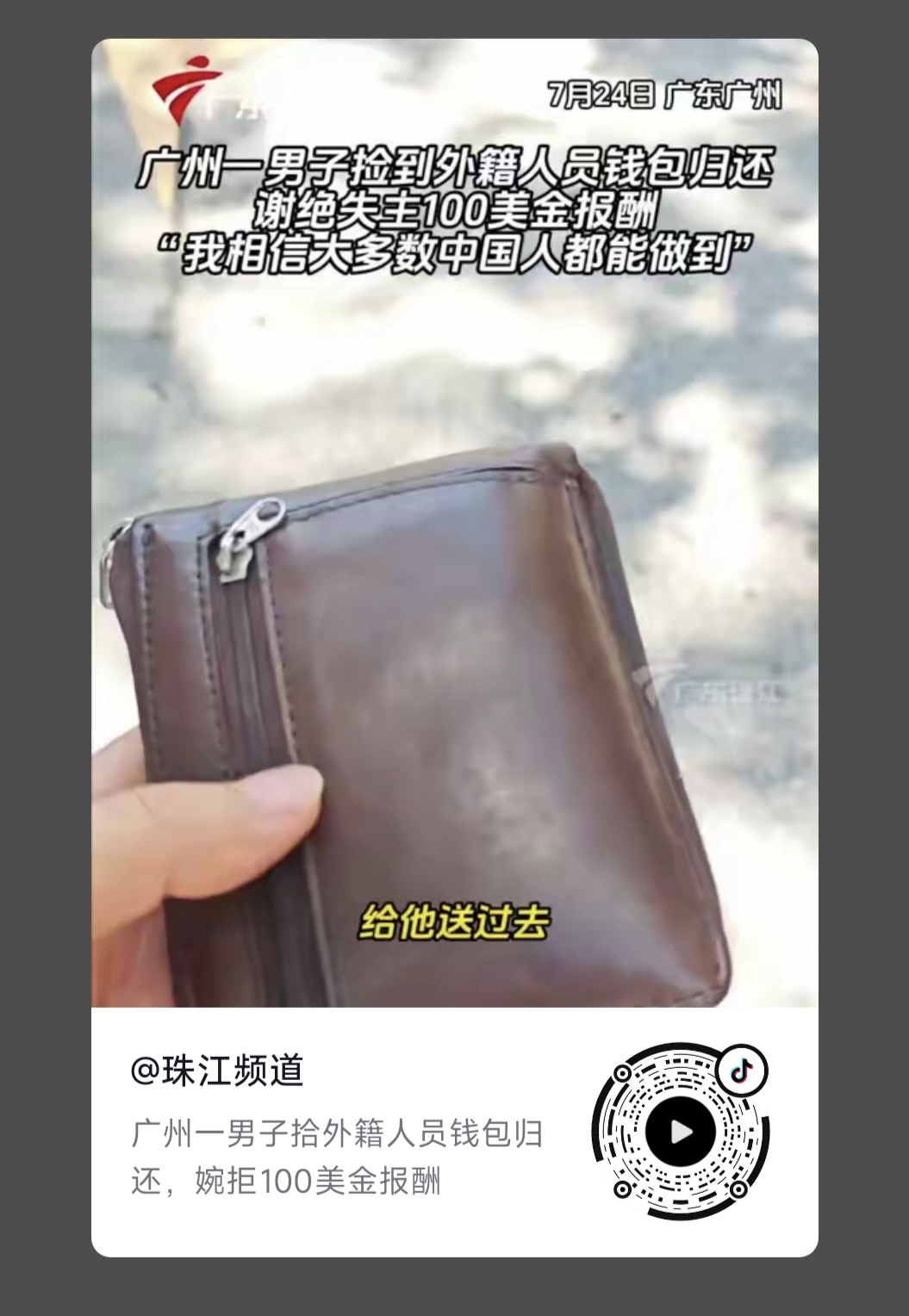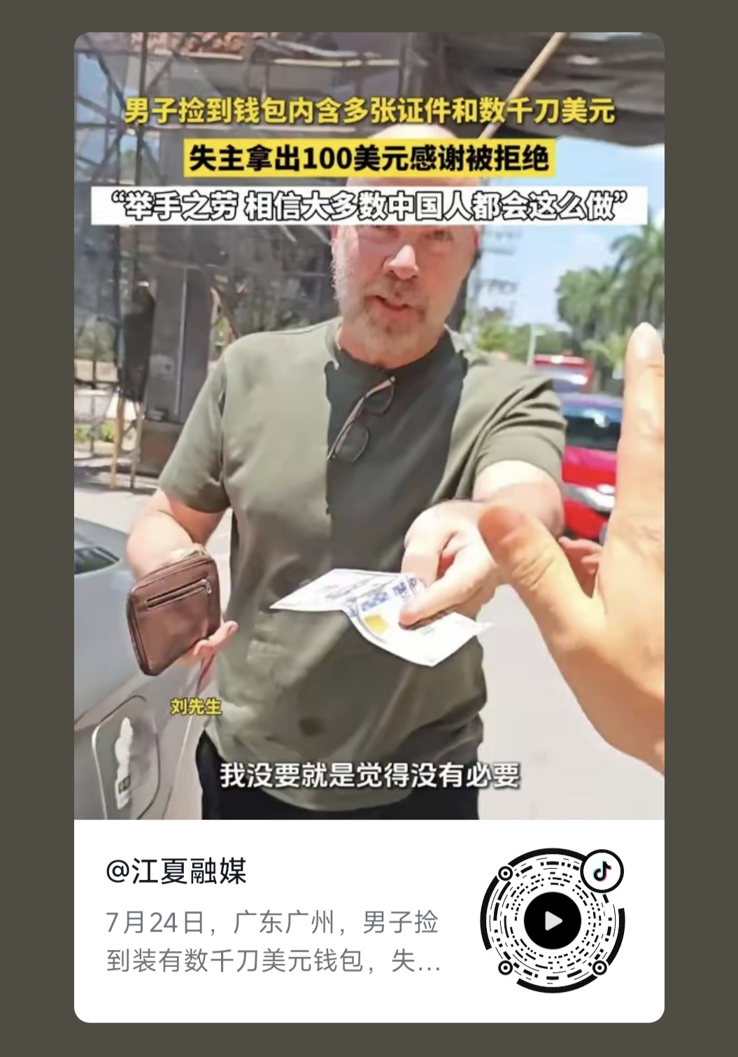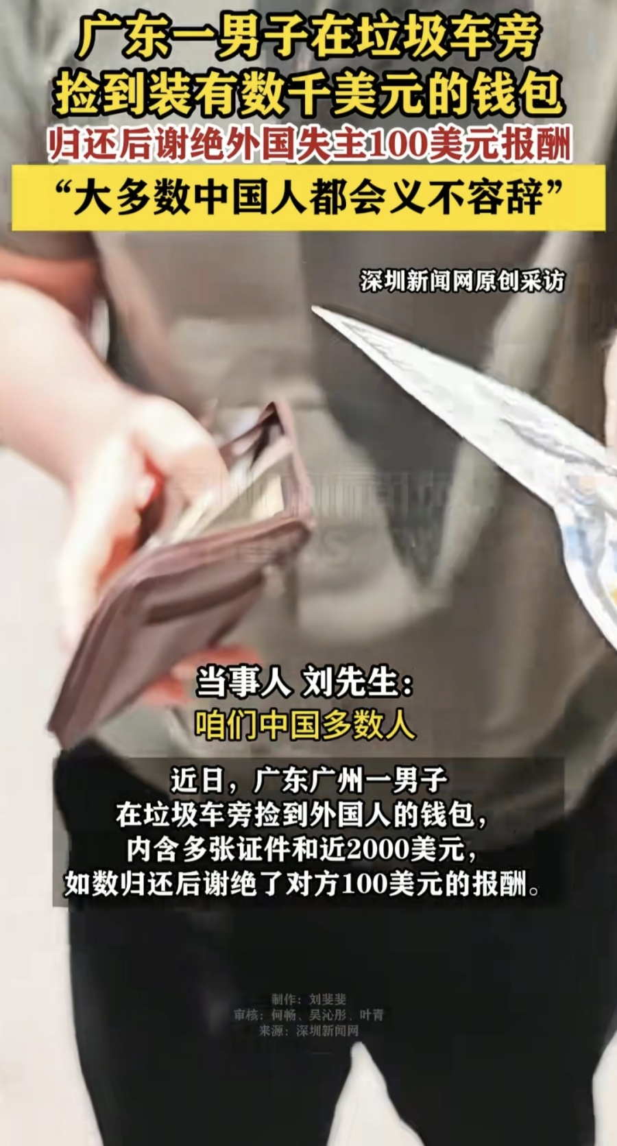 2025年7月24日中午,我公司職員劉先生撿到了一(yī)個裝有美(měi)金和證件的錢包,經確認是一個外國人(rén)丟失(shī)的,並在第一時間和他的翻譯(yì)取得聯係,當麵把錢(qián)包(bāo)送(sòng)到外國(guó)人手裏,現場的外國人(rén)掏出一百(bǎi)美金給予酬謝,被我公司職(zhí)員劉先生拒絕了,此事引起社會粉(fěn)絲及(jí)大眾媒體高度關注,一度成為熱點(diǎn)榜第(dì)一,形成(chéng)了多個焦點爭論: