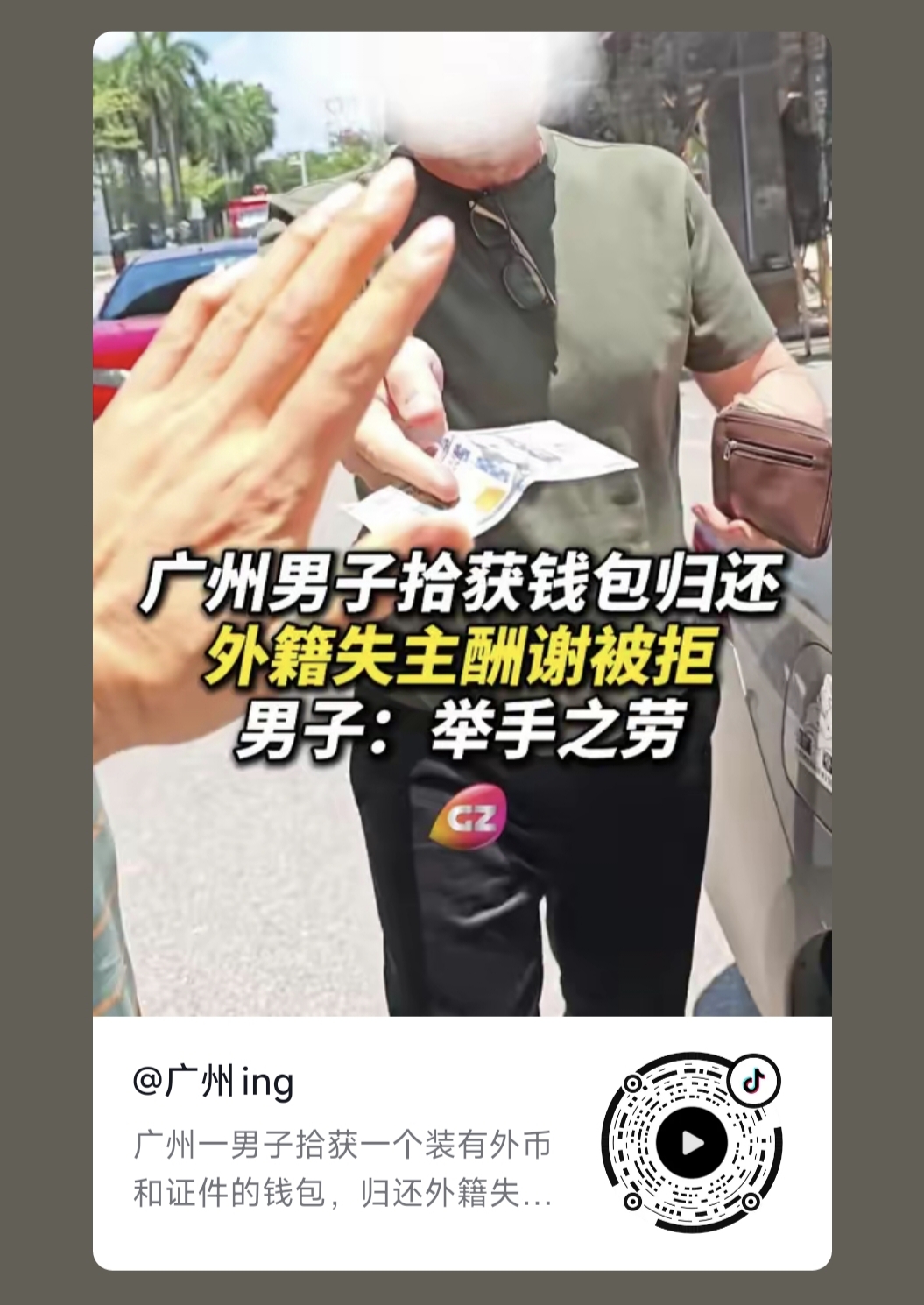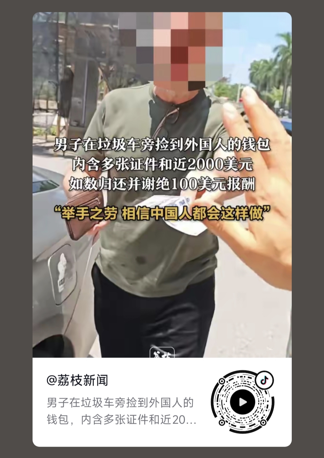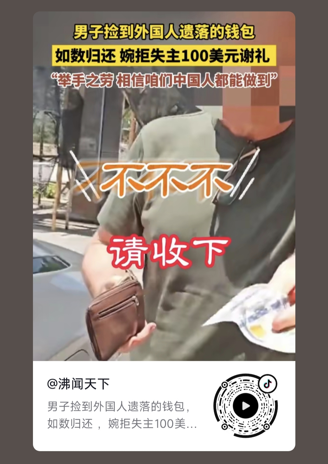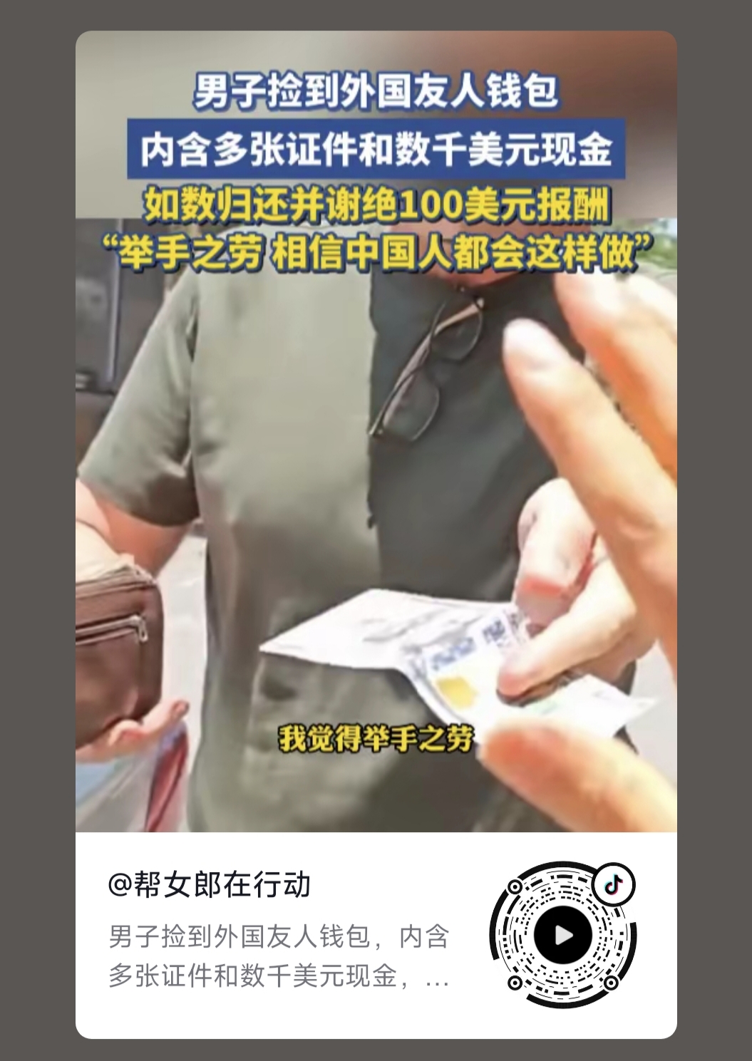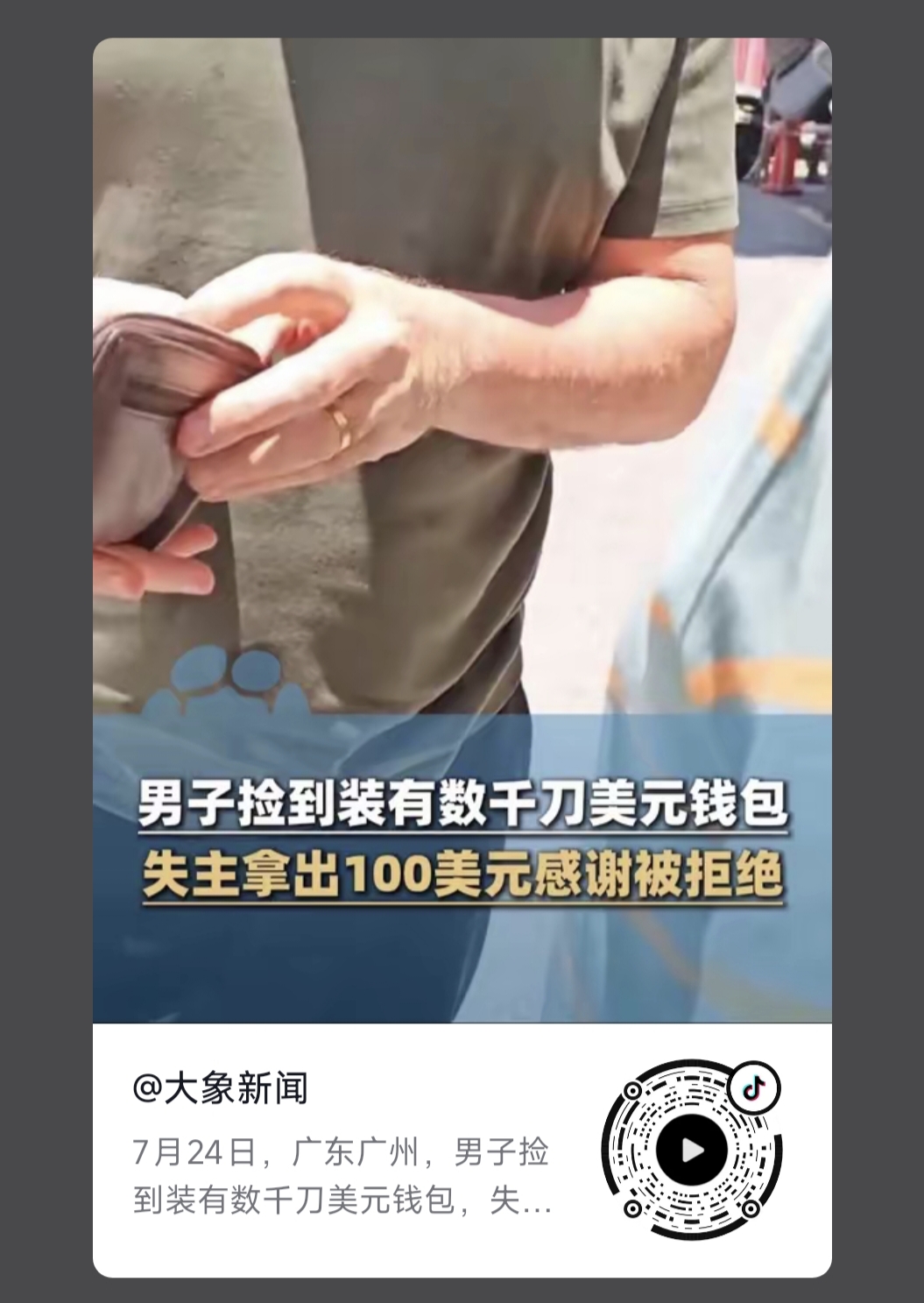 2025年7月24日中午,我公司職員劉先生撿到了一(yī)個裝有美(měi)金和證件的錢包,經確認是一個外國人(rén)丟失(shī)的,並在第一時間和他的翻譯(yì)取得聯係,當麵把錢(qián)包(bāo)送(sòng)到外國(guó)人手裏,現場的外國人(rén)掏出一百(bǎi)美金給予酬謝,被我公司職(zhí)員劉先生拒絕了,此事引起社會粉(fěn)絲及(jí)大眾媒體高度關注,一度成為熱點(diǎn)榜第(dì)一,形成(chéng)了多個焦點爭論: