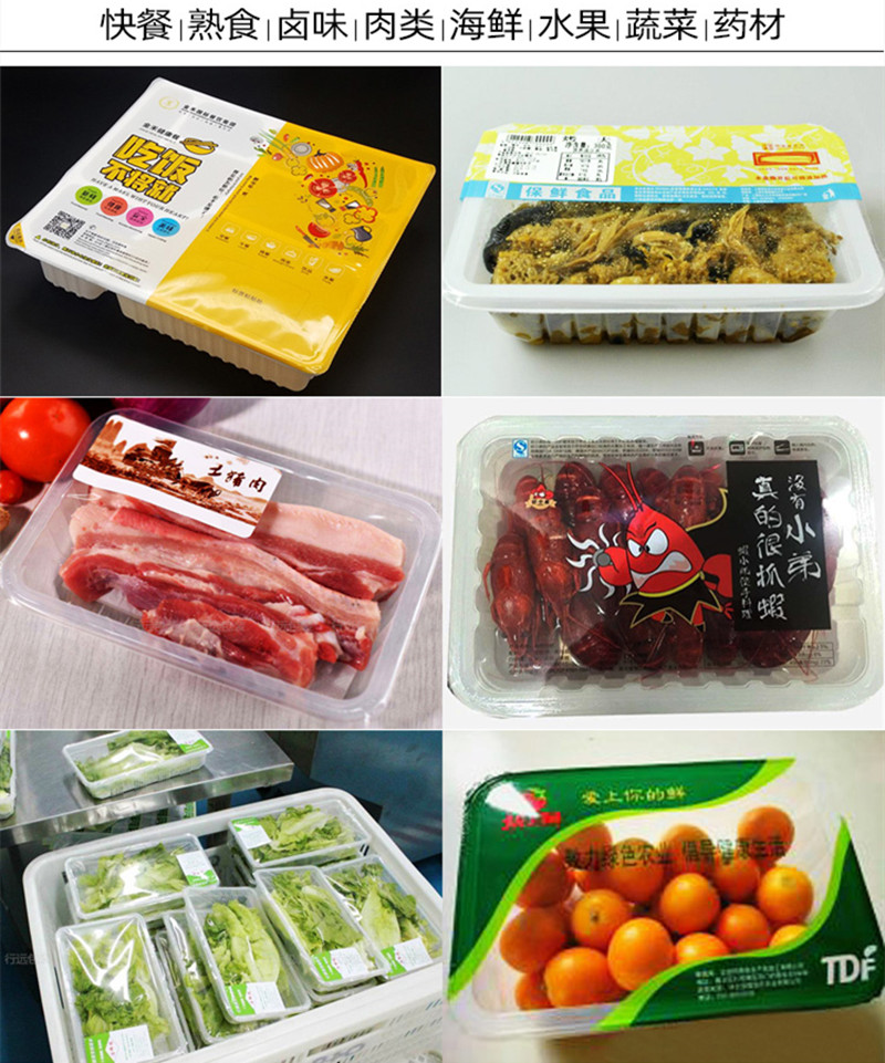 氣調保鮮包裝原理(lǐ):通過電器控製係統控製執行係統的氣缸(gāng),完成下模的進出和與上模的分模、合模、熱封(fēng)、切膜及收膜的步(bù)驟等。放盒→按開關→下模進入(到位)→上模(mó)向下與下模合模(到位)→去除自然(rán)空(kōng)氣→充入混合保鮮氣體(N2、O2、CO2 等)(完畢)→密封(fēng)封口、切膜→放(fàng)氣→上下模具分開→下模退出、包裝成品頂出→拿出成品。