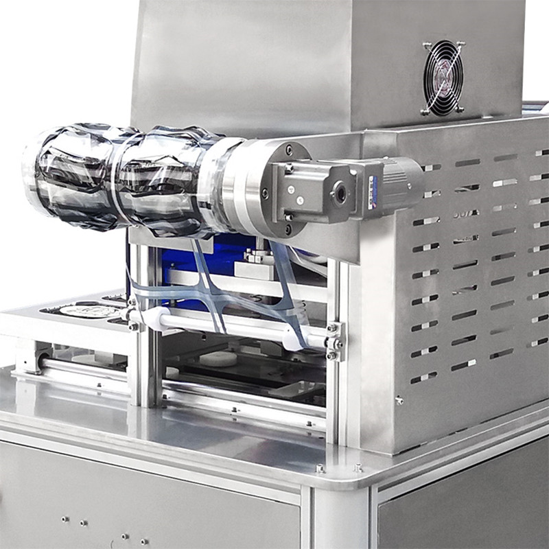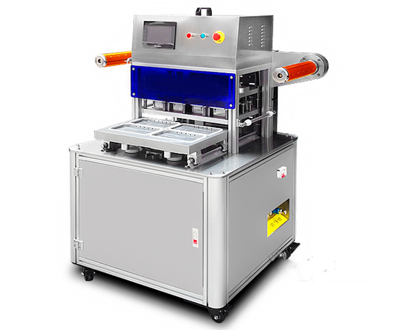 普通封口原理:上下模合模→封(fēng)口切膜(完畢)→下模(mó)退(tuì)出、包裝成品頂(dǐng)出。注:放氣後上模、下模複位,完成一次工作循環。
