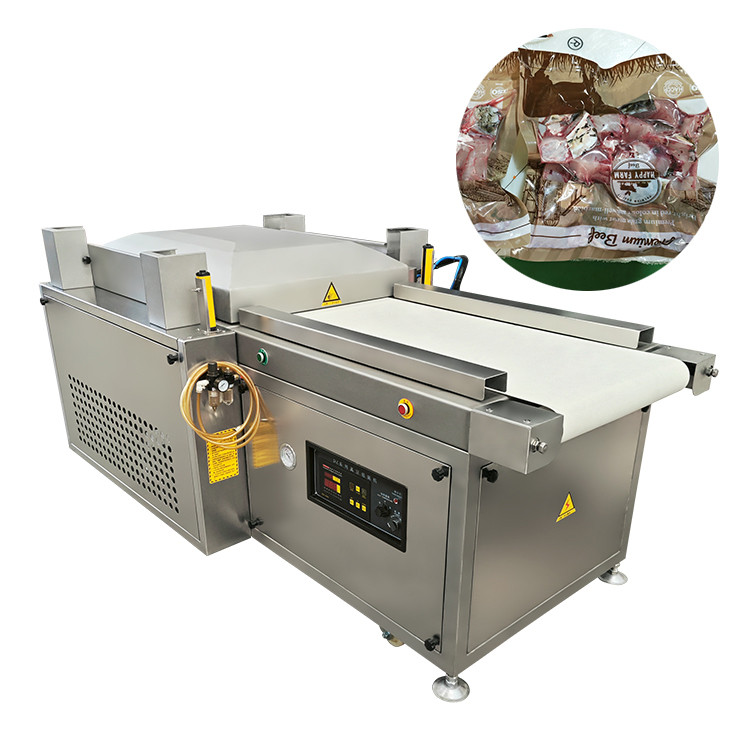 橫(héng)向滾動真空包裝機是在普通包裝(zhuāng)機(jī)基(jī)礎上開發的一(yī)種自動化程度較高(gāo)的設備(bèi)。人工在擺(bǎi)料區放好物品後,輸送帶自動會把物料輸送到工作室,工作室會自動下降,完成真空、封口。然後工作室上升,包裝好的物品會自動輸送出去,具(jù)有省工、省力、工作效率高的優點,特別適合包裝大塊(kuài)牛羊肉。下料(liào)區可以連接熱縮機。