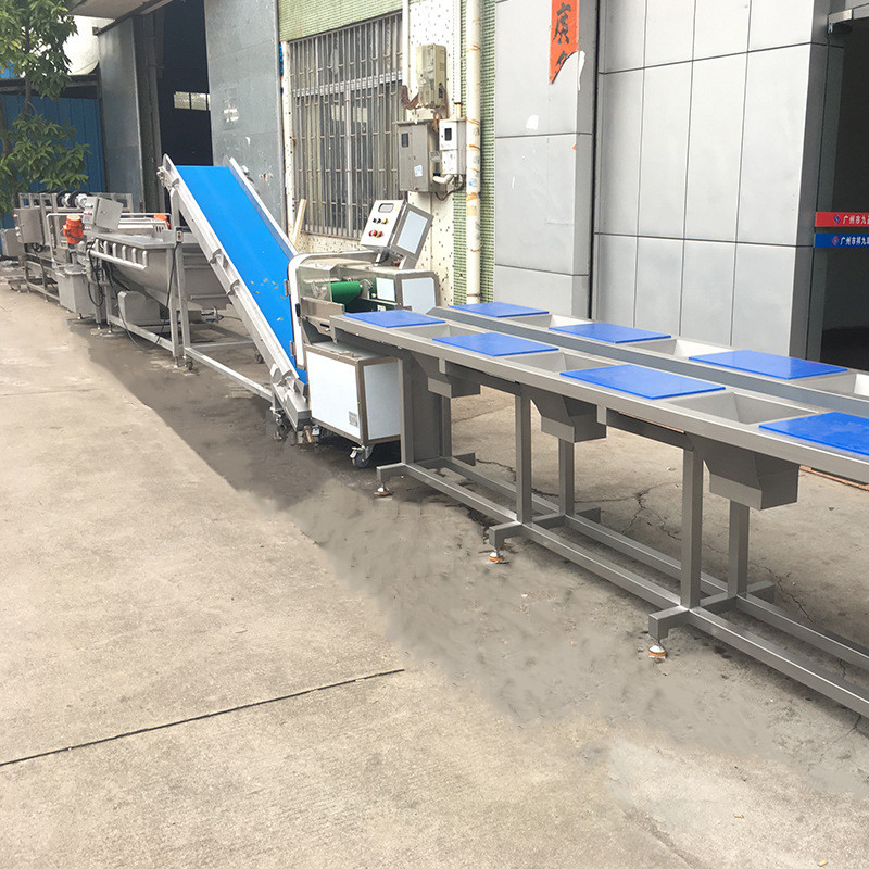 本生產線一共5 台(tái)設備,分為雙層挑選機—切菜機—提升機—鼓泡清洗機--—風幹(gàn)機(震動瀝水),整條生產線的總(zǒng)功 率(lǜ)約(yuē)10 千瓦,長度為12 米,整條生產線設計合理,外觀大方,產量可定做